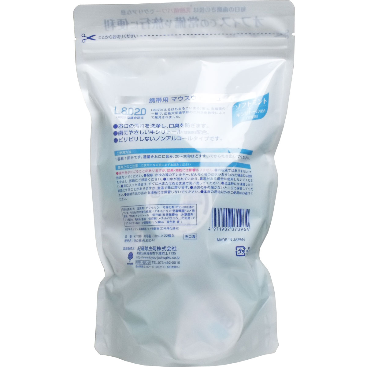 個装サイズ:159X263X70mm個装重量:約330g内容量:12mL×22個入製造国:日本【ケース入数:6X6】【発売元:紀陽除虫菊】【成分】基剤・・・水湿潤剤・・・グリセリン可溶化剤・・・PEG-60水添ヒマシ油その他(口中浄化成分)・・・デキストリン、乳酸桿菌/コメ発酵物甘味剤・・・キシリトール保存剤・・・安息香酸NapH調整剤・・・リン酸2Na香味料・・・香料保存剤・・・メチルパラベンその他・・・グリチルリチン酸2KpH調整剤・・・リン酸Na着色剤・・・青1【使用方法】・1容器1回分です。