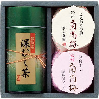 ●深蒸し茶100g・こだわり梅100g・天日干し100g×各1●化粧箱入●箱サイズ約18.5×18×8cm※のし包装(ラッピング)はひとつずつ無料で致します。